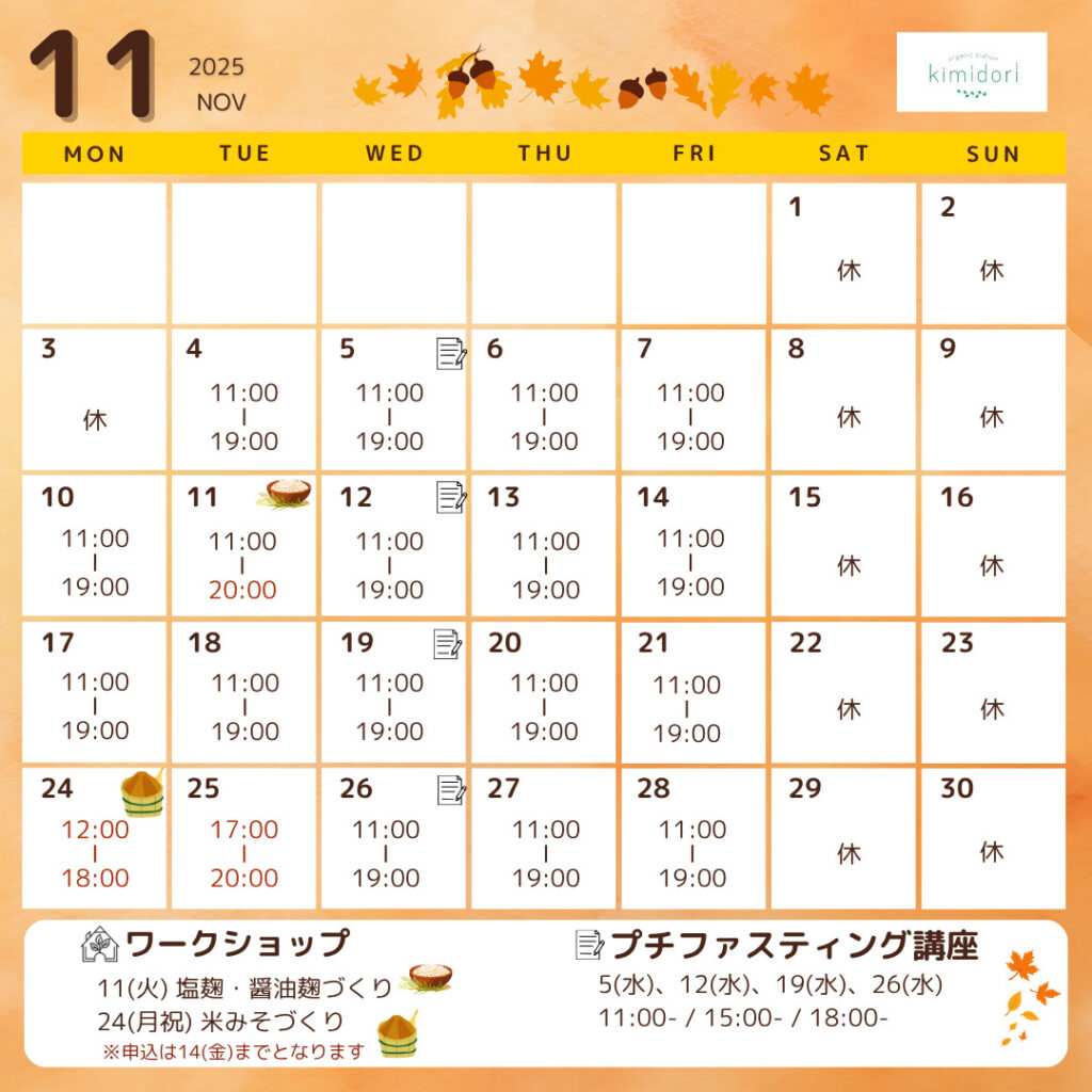 11/11(火)『塩麹・醤油麹づくり』11/24(火)『米みそづくり』※申込は11/14(金)まで
